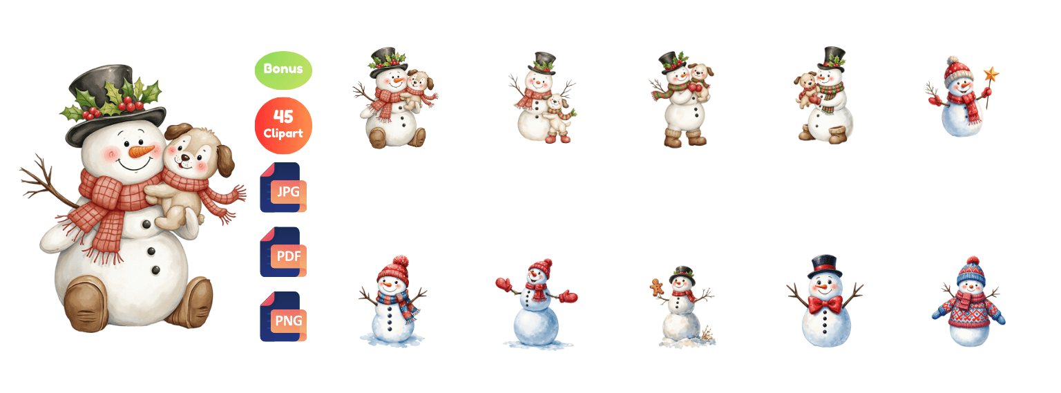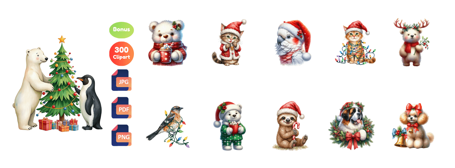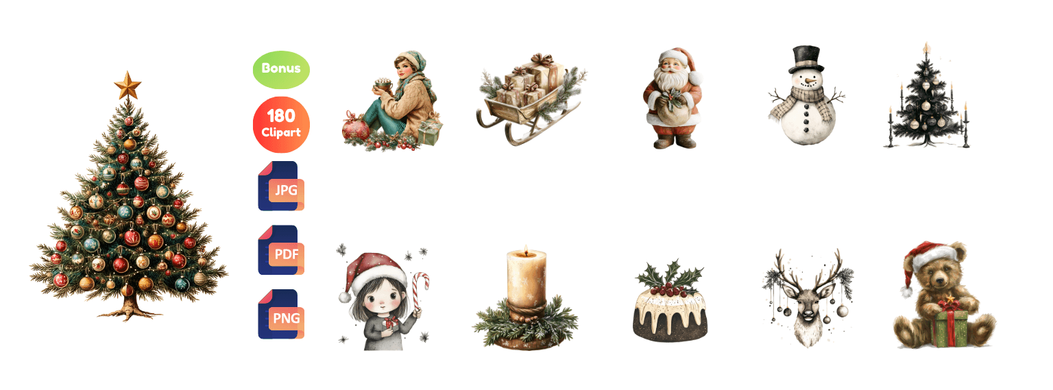 Download 1,800+ high-quality Christmas Cliparts (plus 500 bonus mix cliparts), delivered in JPG and PNG formats ready to use in any project.