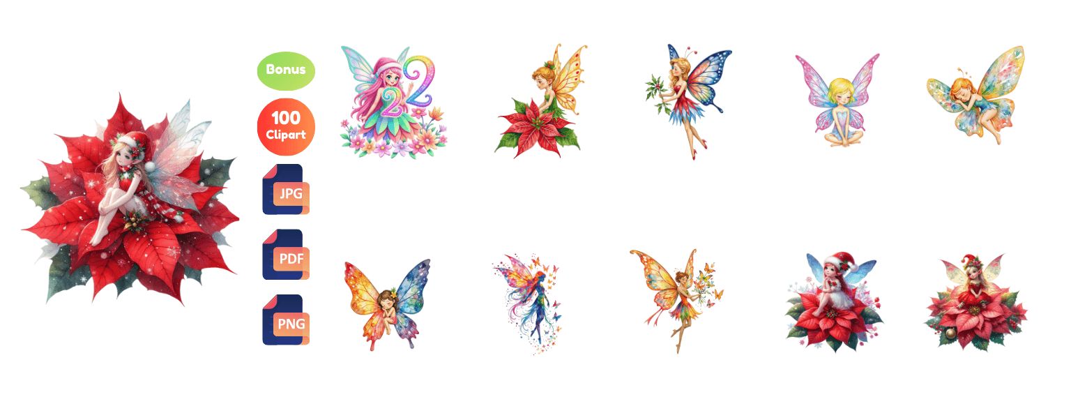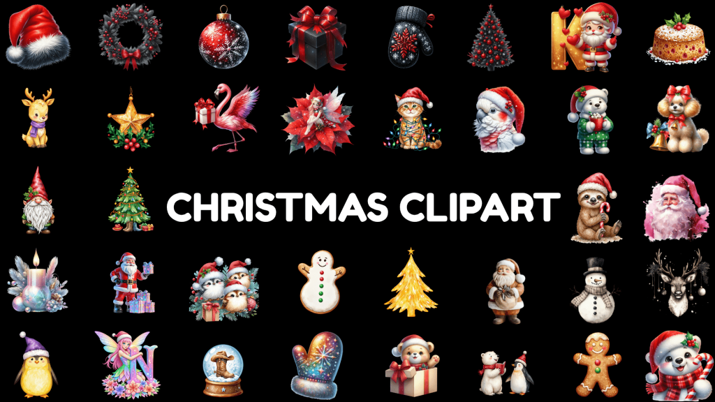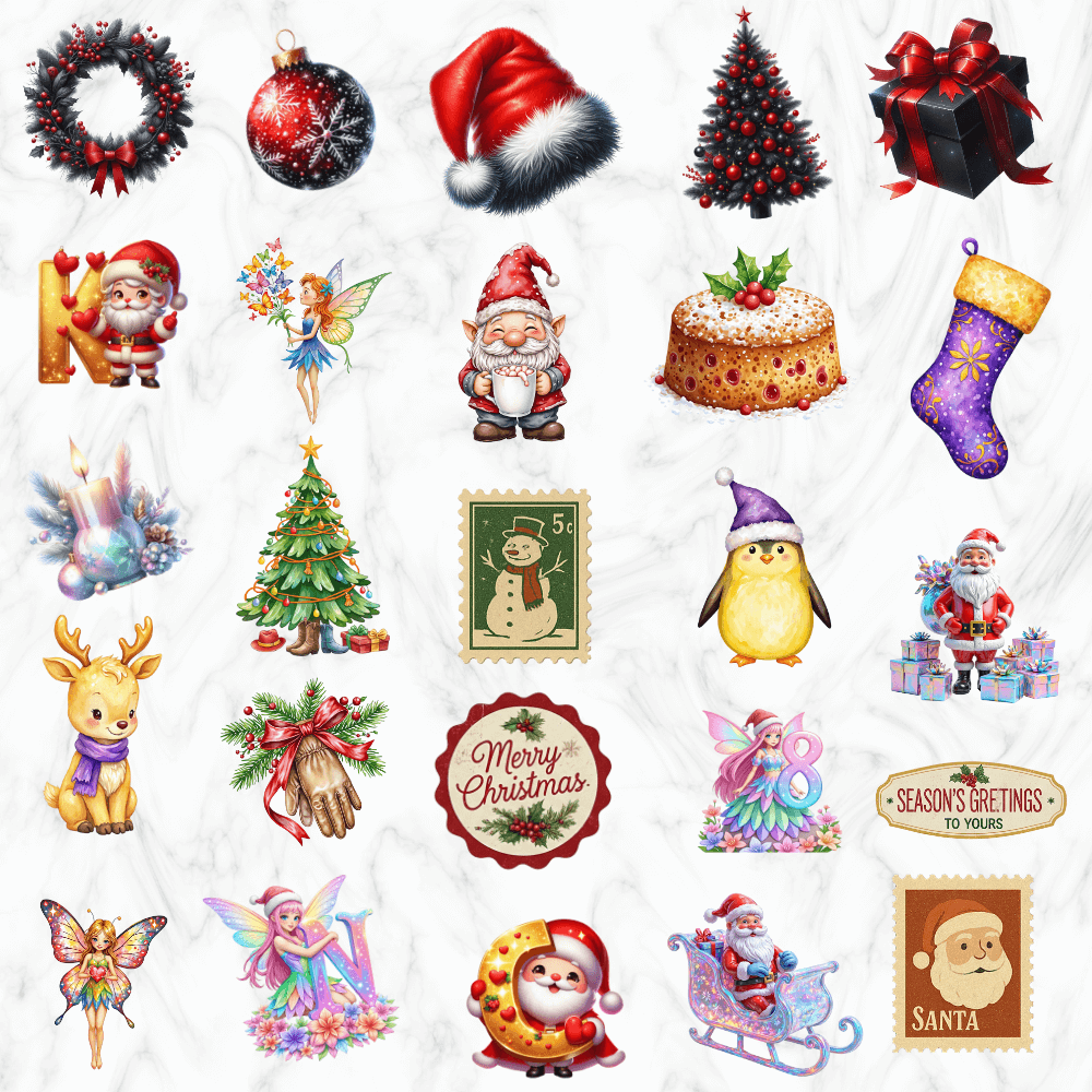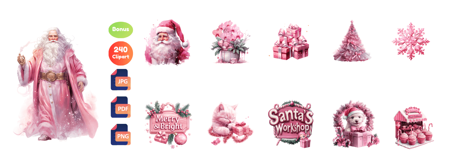 🎄 1800+ Christmas-Themed Cliparts:- A huge collection of high-quality Christmas illustrations — including Santa, animals, snowmen, houses, vintage art, fairies, pink Christmas elements, and more.