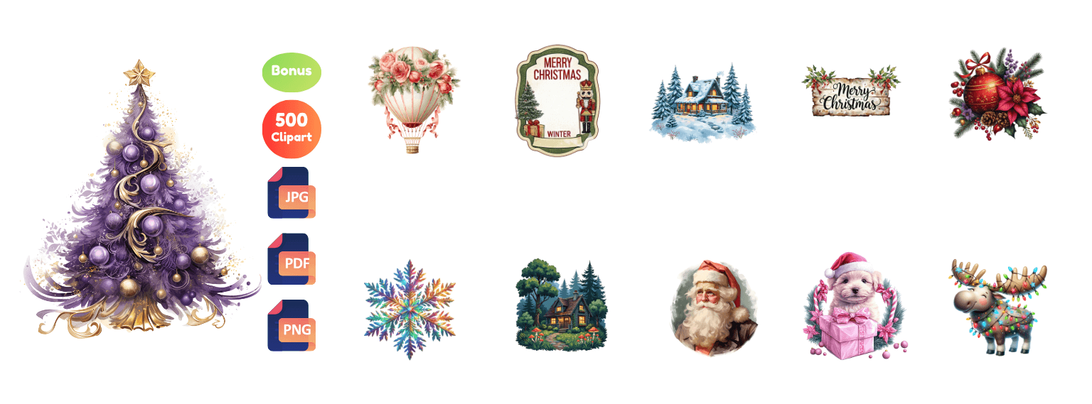 🎁 500 Bonus Mix Cliparts:- Extra Christmas elements like ornaments, gifts, characters, winter items, and decorative icons to expand your design library.