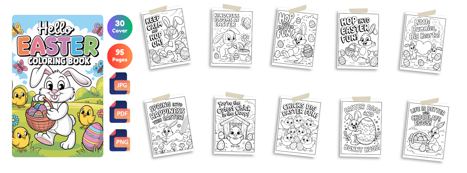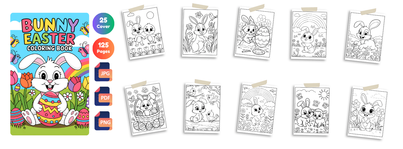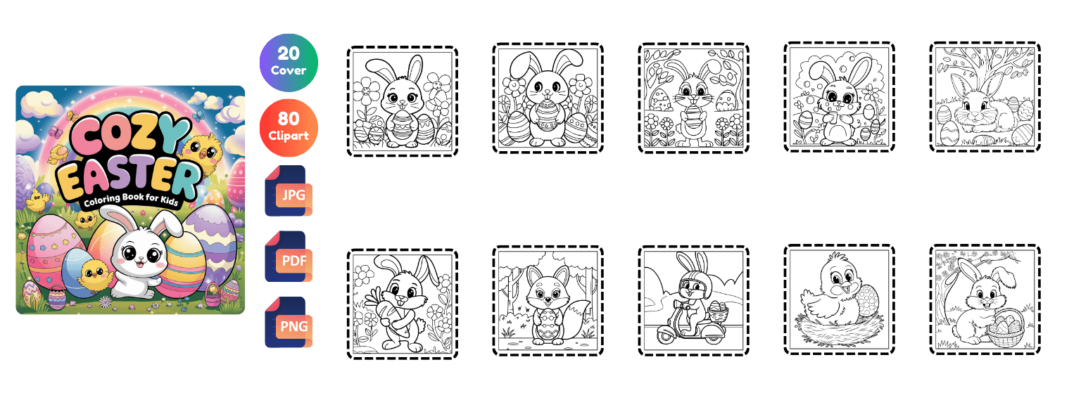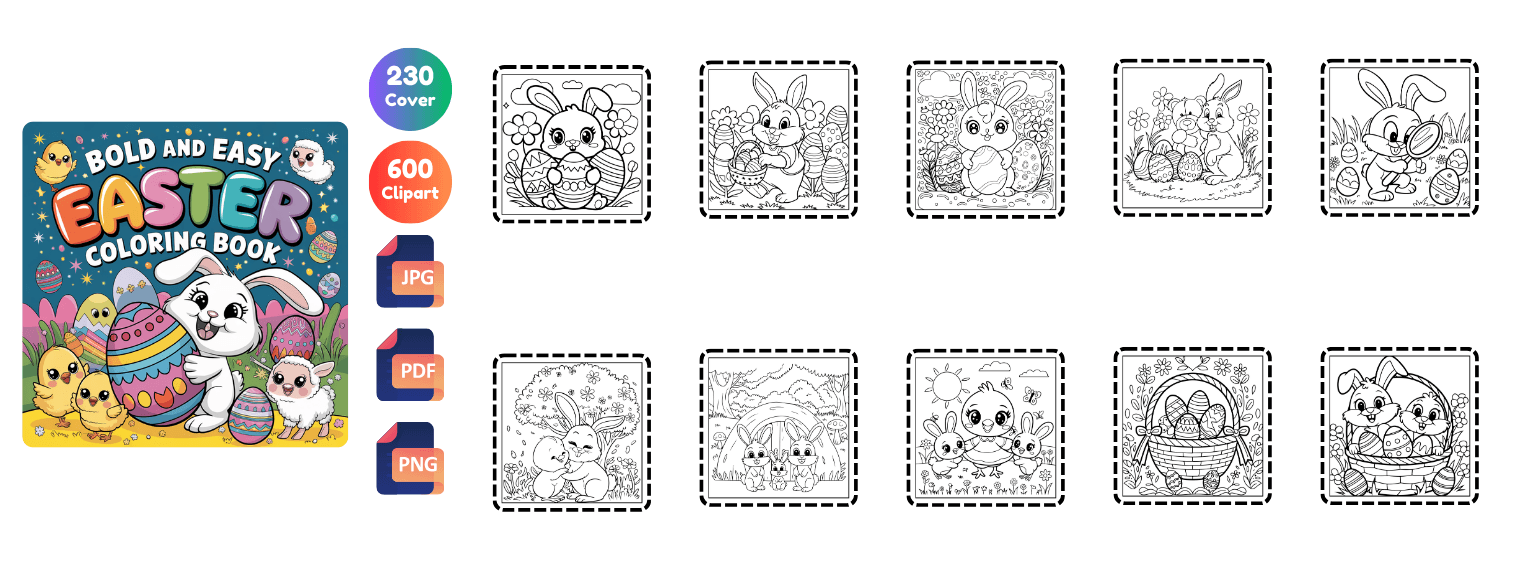 Get 2400+ Easter coloring pages packed with cute bunnies, eggs, cozy scenes, and festive designs. Perfect for kids, adults, and coloring lovers. Plus, you’ll also get 650 bonus book cover designs ready for publishing!