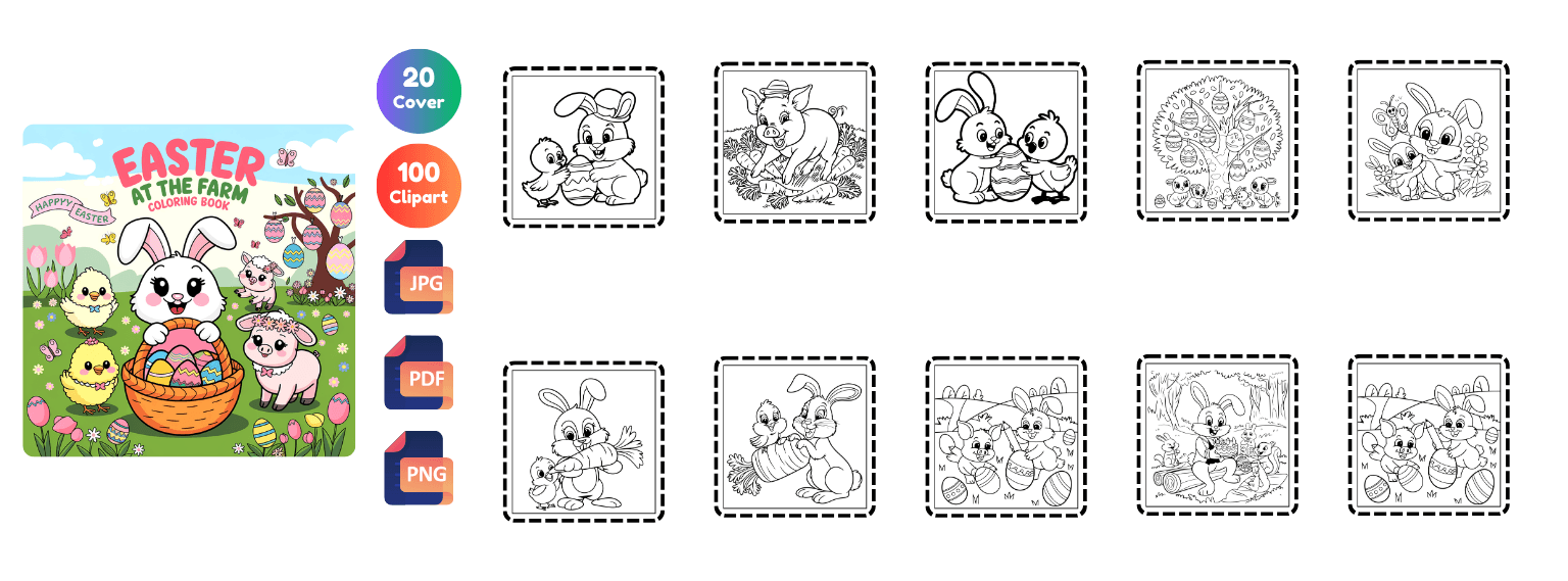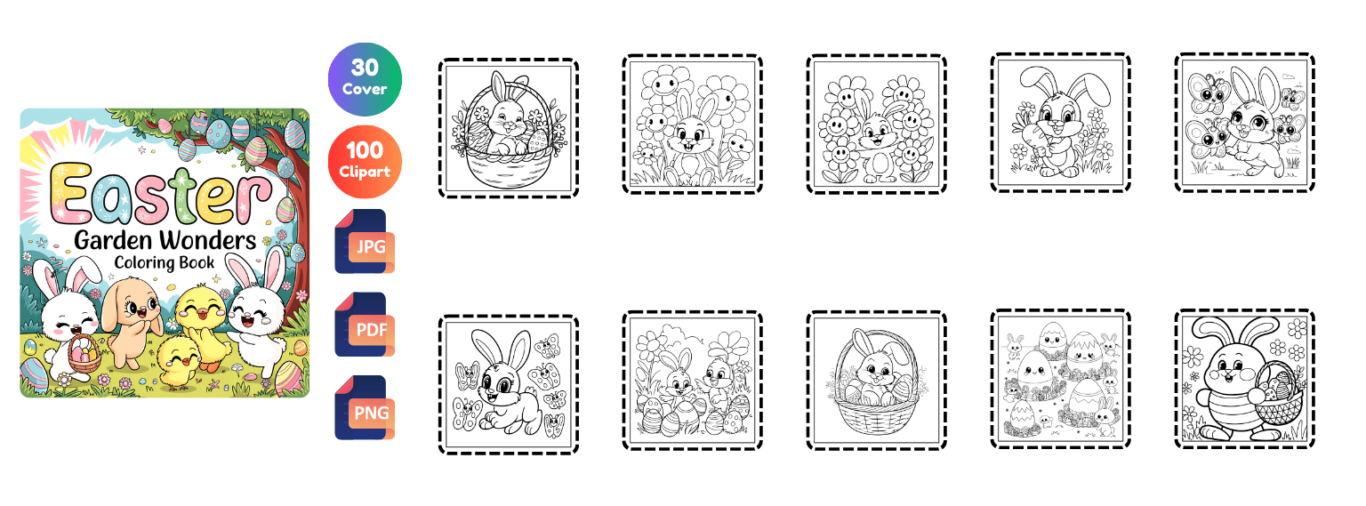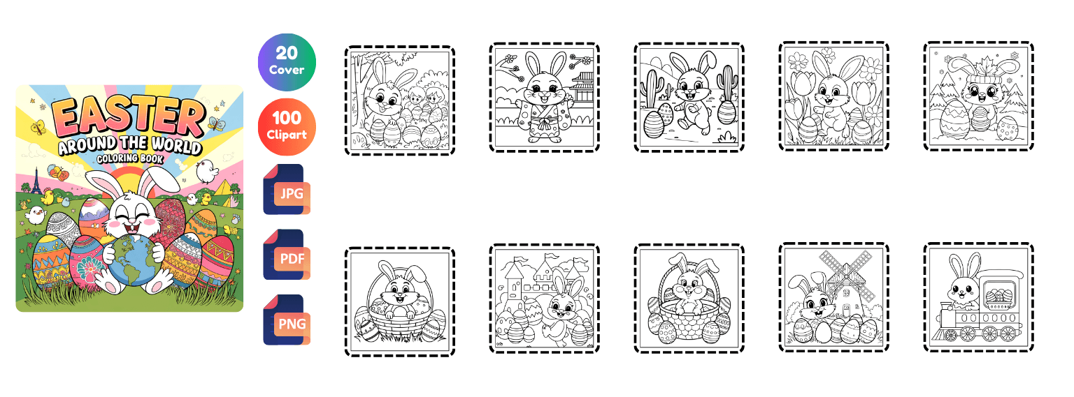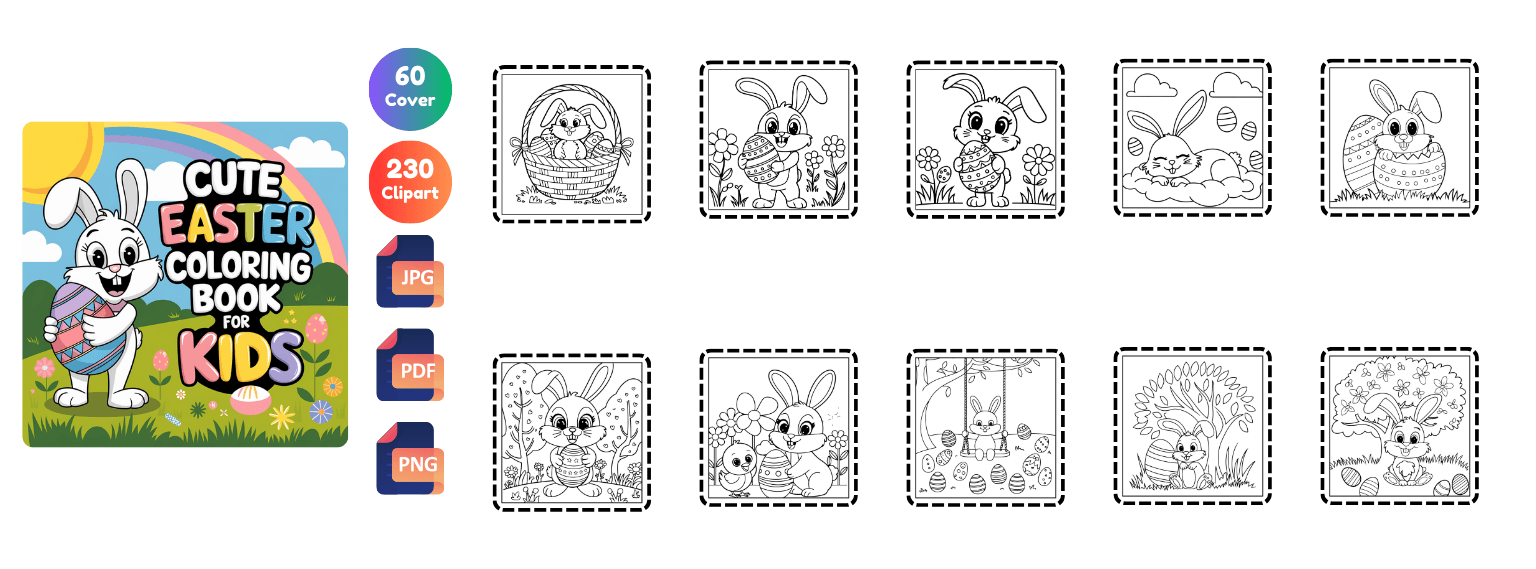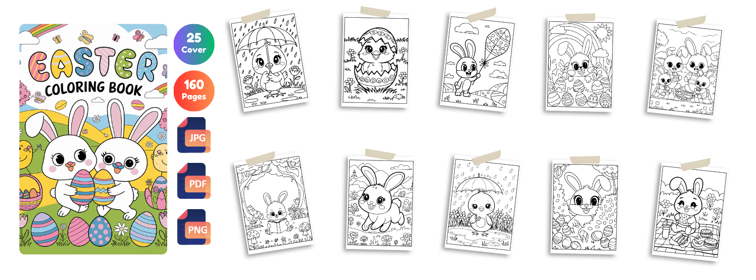 Get 2400+ Easter coloring pages packed with cute bunnies, eggs, cozy scenes, and festive designs. Perfect for kids, adults, and coloring lovers. Plus, you’ll also get 650 bonus book cover designs ready for publishing!