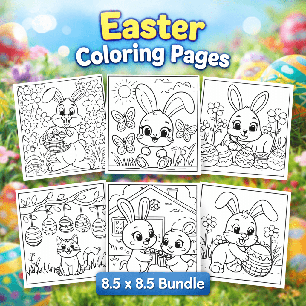 A large collection of Easter-themed coloring pages designed in the popular square 8.5 × 8.5 inch format. Perfect for modern coloring books featuring cute bunnies, Easter eggs, cozy scenes, and fun holiday illustrations.